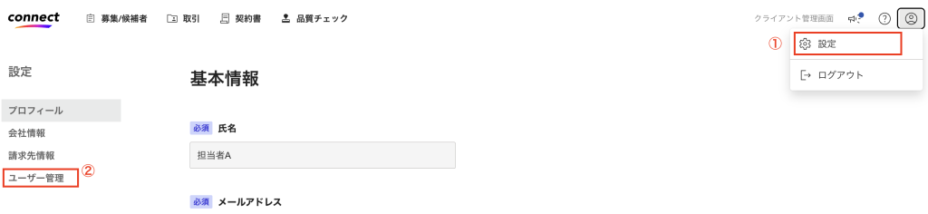 プロフィール編集(社名・住所・電話番号・請求書の送付先・アカウントの追加、編集、削除)が不可となります。