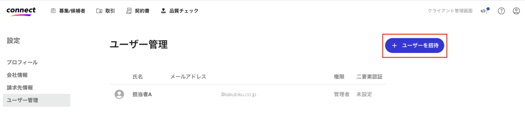 ②をクリックすると「ユーザーを招待」の青いボタンがございますので、そちらよりユーザーの追加が可能となります。